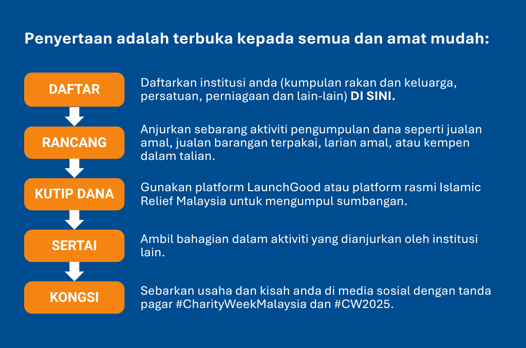 Charity Week ialah kempen global yang dikendalikan sepenuhnya oleh sukarelawan dengan visi untuk menyatukan Ummah. Pada tahun ni Charity Week akan berlangsung pada 20 – 26 Okt 2025.